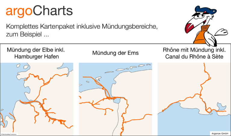 Mit unseren argoCharts bieten wir euch noch mehr! Wir decken die wichtigsten Fahrtbereiche ab, auf denen professionelle Binnenschiffe in Zentraleuropa navigieren – und das beinhaltet neben den Flüssen nun auch die Mündungsbereiche von Elbe, Weser, Ems und auch Rhône.